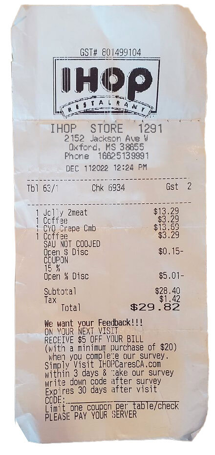 Ms. Mason provided a receipt from the IHOP restaurant on Jackson Avenue dated December 11, 2022, at 12:24 p.m.