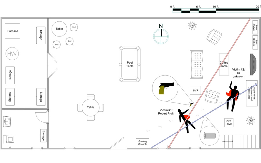 Forensic analysts used data collected at the crime scene to determine likely trajectories for the bullets fired in the Pruitt basement.
