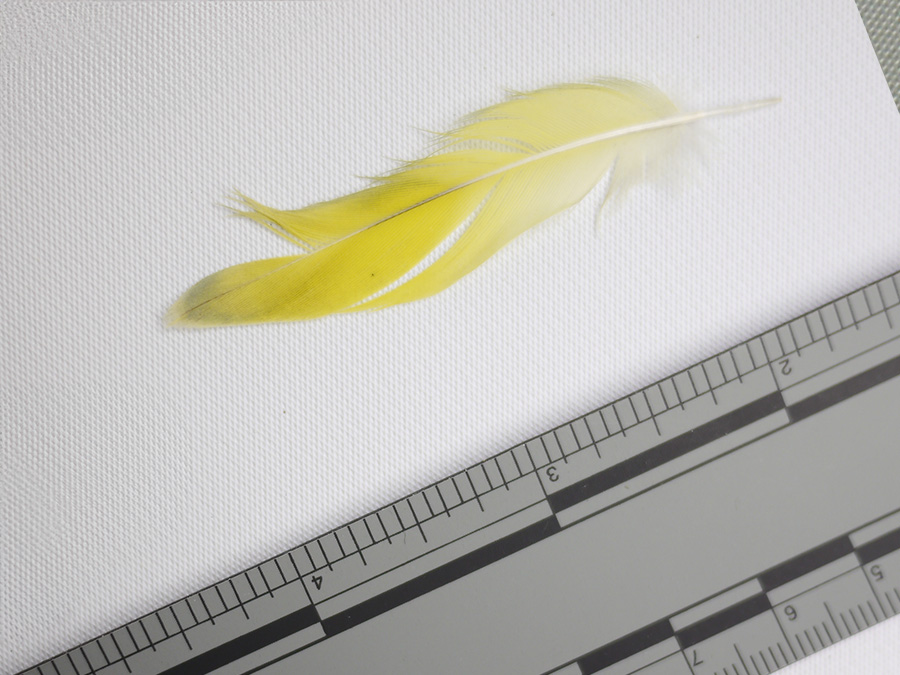 003897-02: One (1) feather recovered from the floor 3.4" south and 9.7" west of the victim's right foot p> |